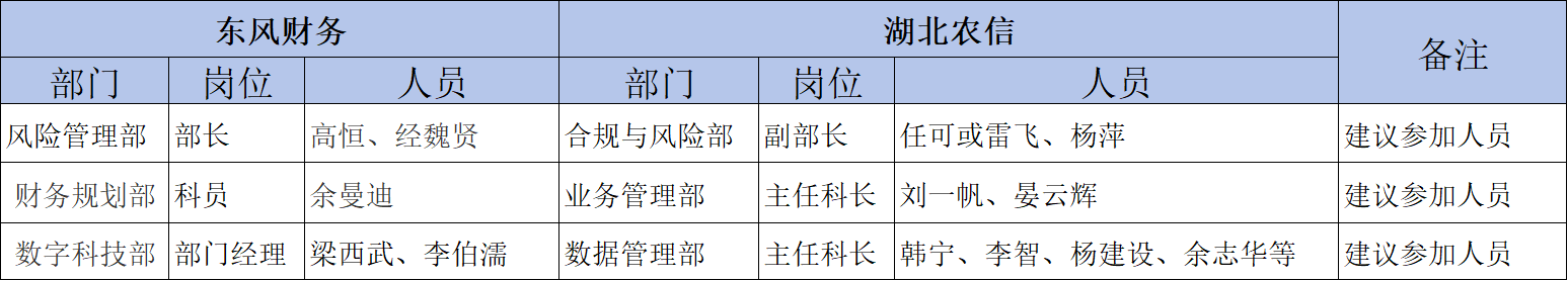 2)东风人员:风险管理部:高恒部长;风险管理部:经魏贤,财务规划部:余曼迪,数字科技部:梁西武、李泊儒
